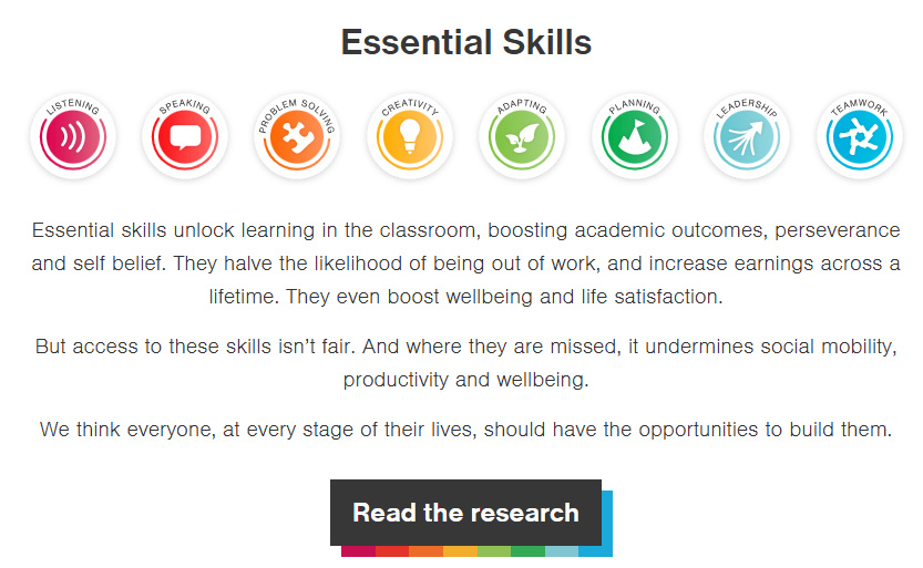 Essential skills support learning in the classroom by boosting academic achievement, perseverance and self-belief. Research shows they can reduce the likelihood of being out of work and increase earning potential across a lifetime. They are also linked to improved wellbeing and life satisfaction.